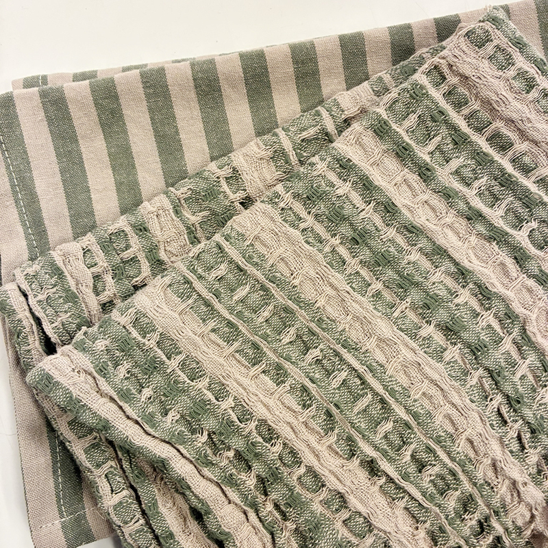 2 pack av fina handdukar till köket. Setet består av två handdukar - den ena vävd i en enkel och stilren design, medan den andra har en våfflad struktur, som ger en taktil känsla. De gröna ränderna är klassiska och tidlösa, och passar lika bra i ett lantligt kök som i ett mer modernt hem. Storlek: 50x70 cm Material: 100% bomull