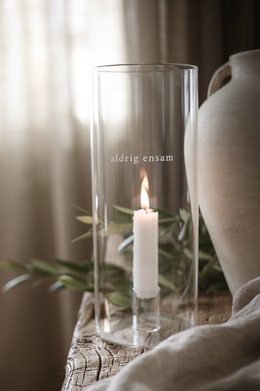 Fin ljuslykta i glas för antikljus. Ljuset står skyddad. med Text: Aldrig ensam i matt vit text