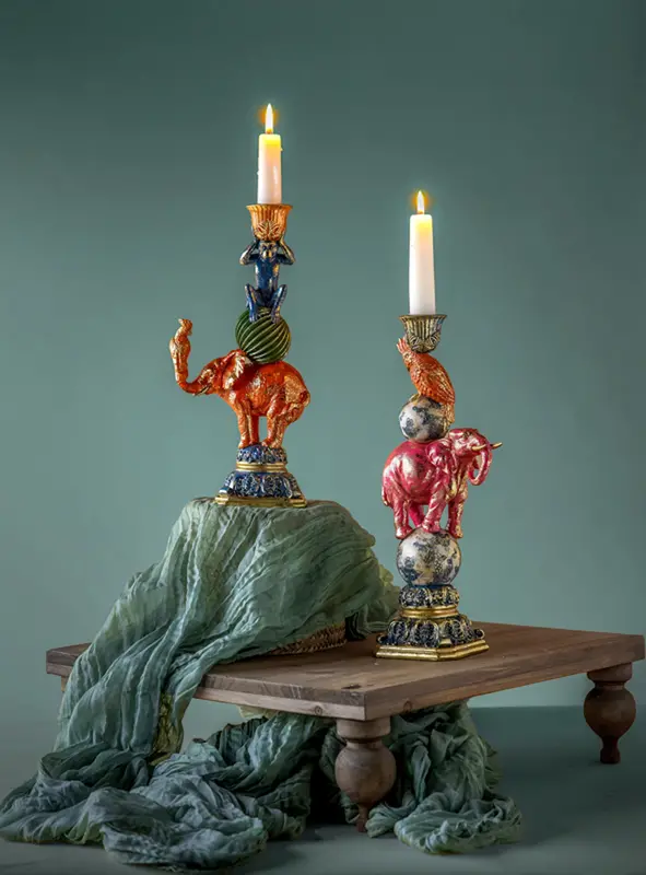 Otrolig charmig, kittchig ljusstake med en elefant och en fågel. Ett fint sätt att få in levande ljus i inredningen. Tillverkad i poly.
