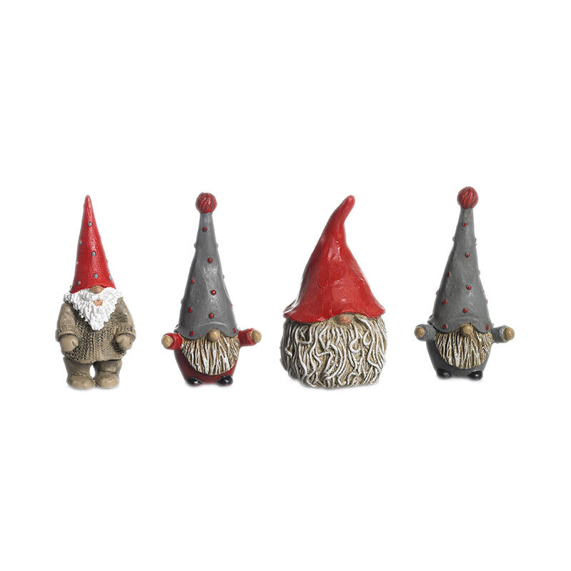 Detta charmiga 4-pack har en mix av olika tomtar, gemensamt har de nedhasade luvor, stora näsor och vitt skägg. De har alla en naturnära färgskala med rustik hantverkskänsla.