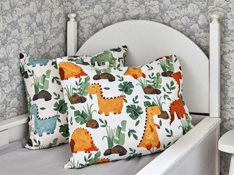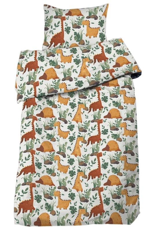 Härligt färgglatt och mönstrat bäddset till barn med gula dinosarier, helt i bomull