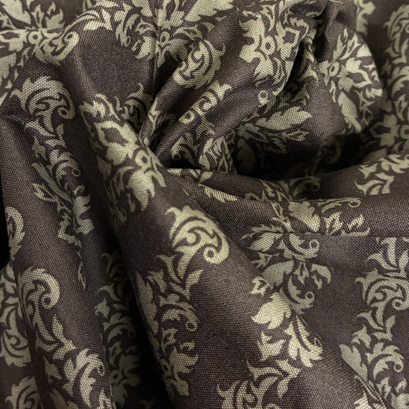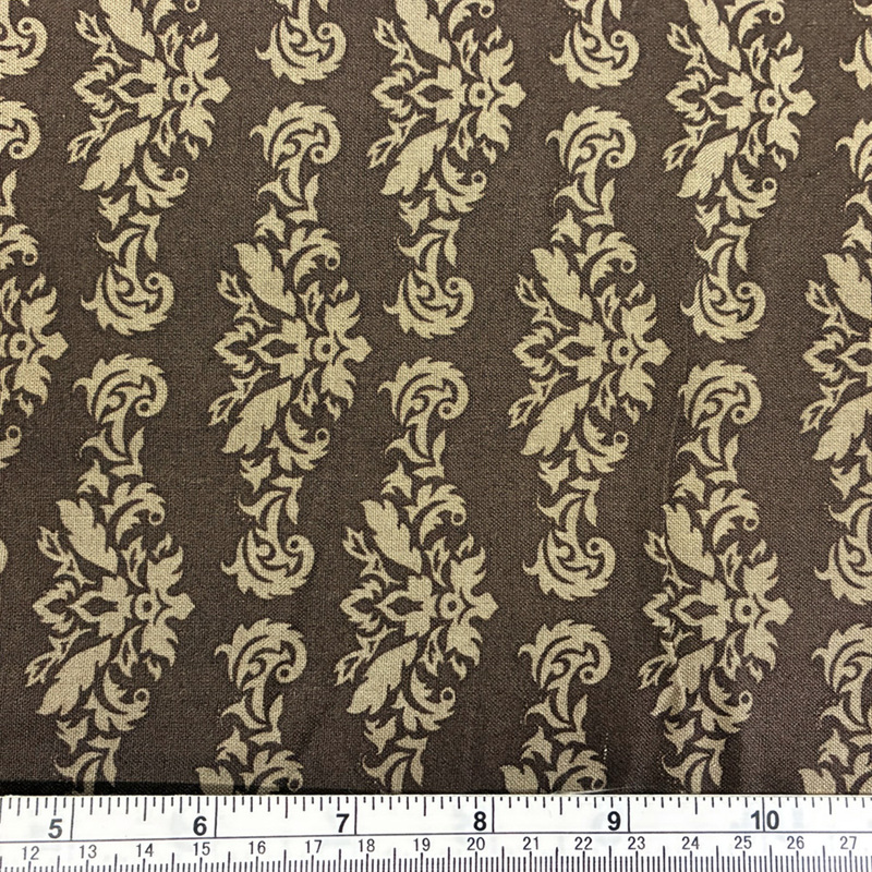Brunt bomulltyg med ett ljusbrunt snirkligt elegant mönster.