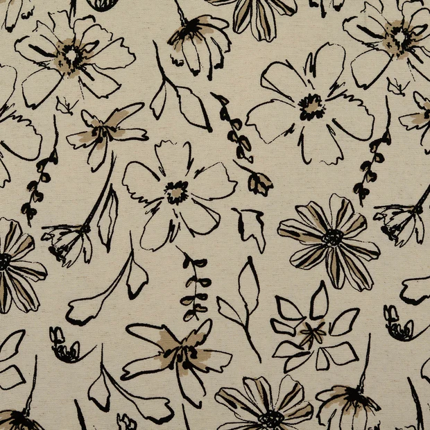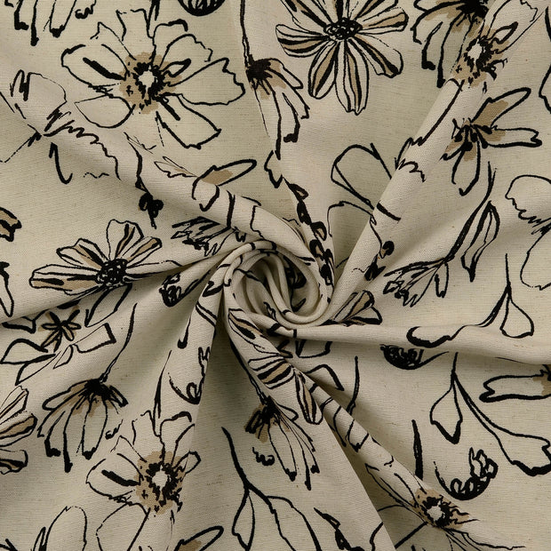 Bredd 142/144 cm vikt 155 g/m2 Composition 89%CV / 10%LI / 1%CO Color Offwhite Quality woven linen Surface Rotation print Motif Flower